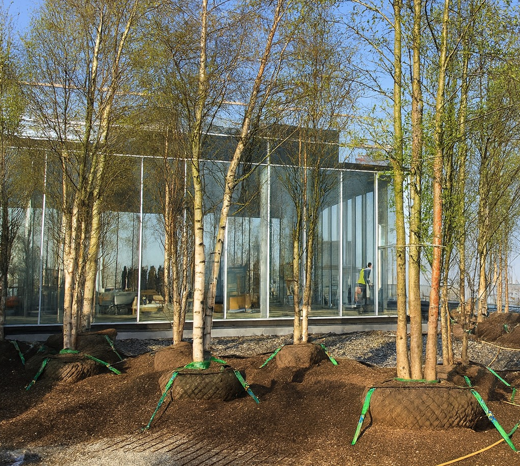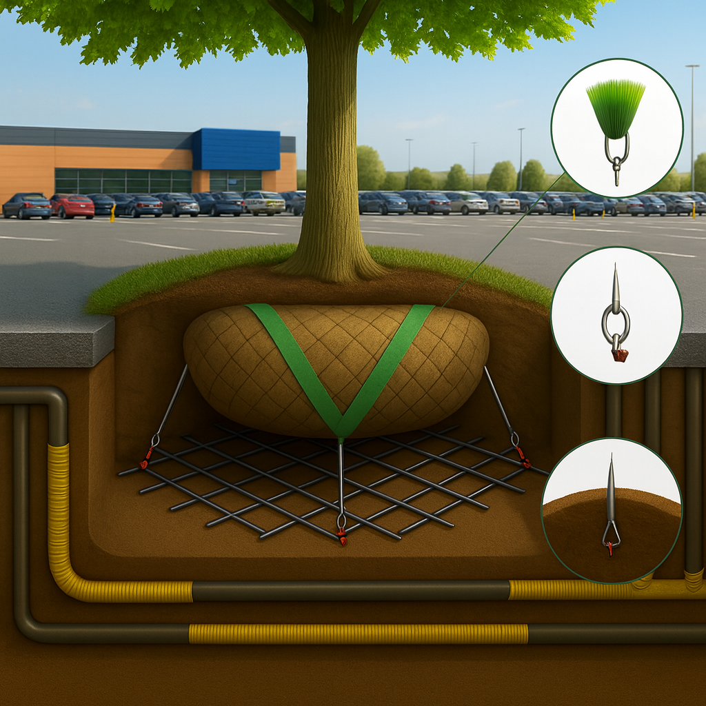 Re-enforcing mesh is placed at the bottom of the planting pit. The root-ball is secured in the following way: three cables with eyelets are attached to the mesh by means of steel shackles positioned equidistant around the base of the root-ball. A ratchet tensioned strap is then passed through the three cable eyelets and wrapped around the root ball and tightened with the ratchet strainer. This secures the root ball firmly and safely in the planting pit eliminating the need for traditional and unsightly timber stakes.