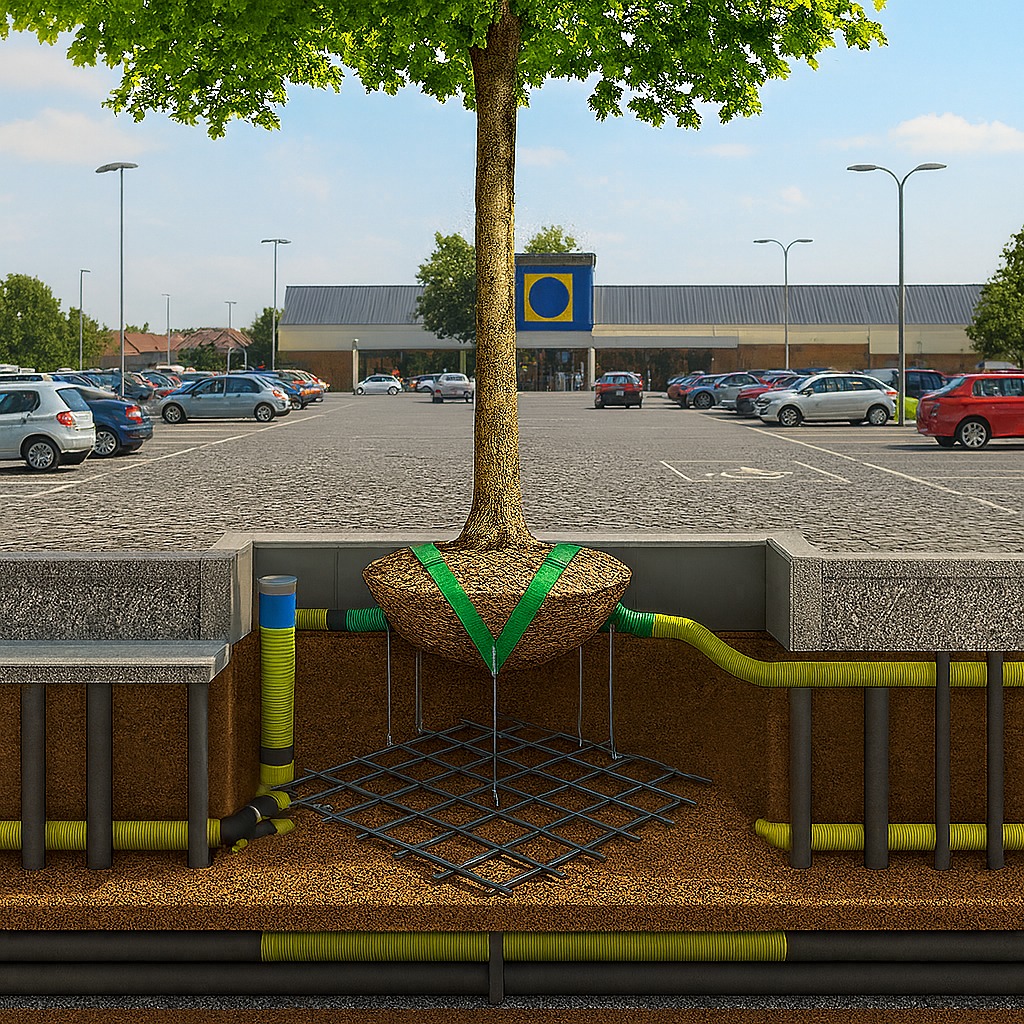 This system provides a solution to tree anchoring in challenging planting situations such as roof gardens, above underground car parks, containers and where normal tree staking is not an option. The system is particularly useful in situations where the planting site is under-passed with services or if the substrate layer is particularly stony and impenetrable for duckbill anchoring.